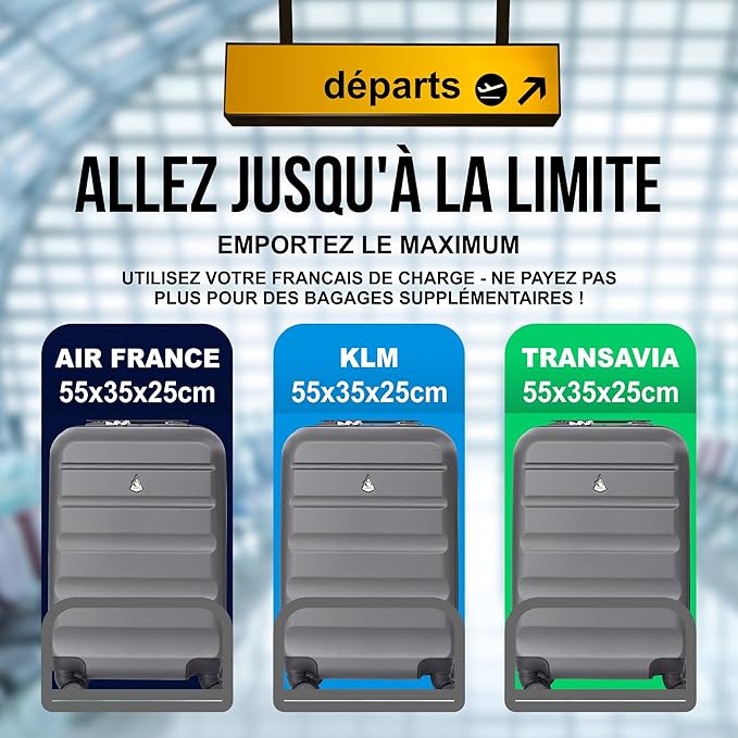 Conçue pour répondre à la politique de bagages à main maximale d'Air France, KLM et Transavia, cette valise cabine correspond à la franchise cabine maximale de 55 x 35 x 25 cm.