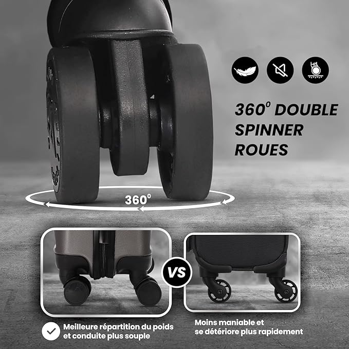 Cette valise cabine est dotée de 4 roulettes doubles, offrant une maniabilité totale à 360 degrés et permettant à la valise de rouler confortablement.