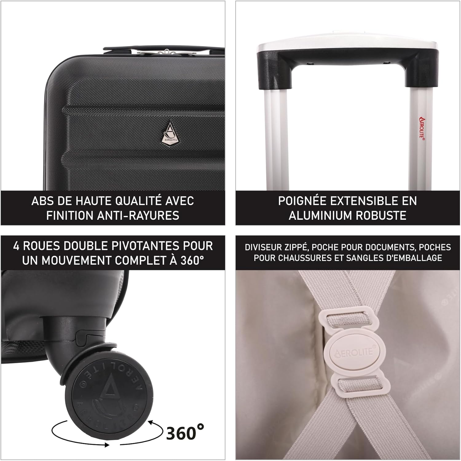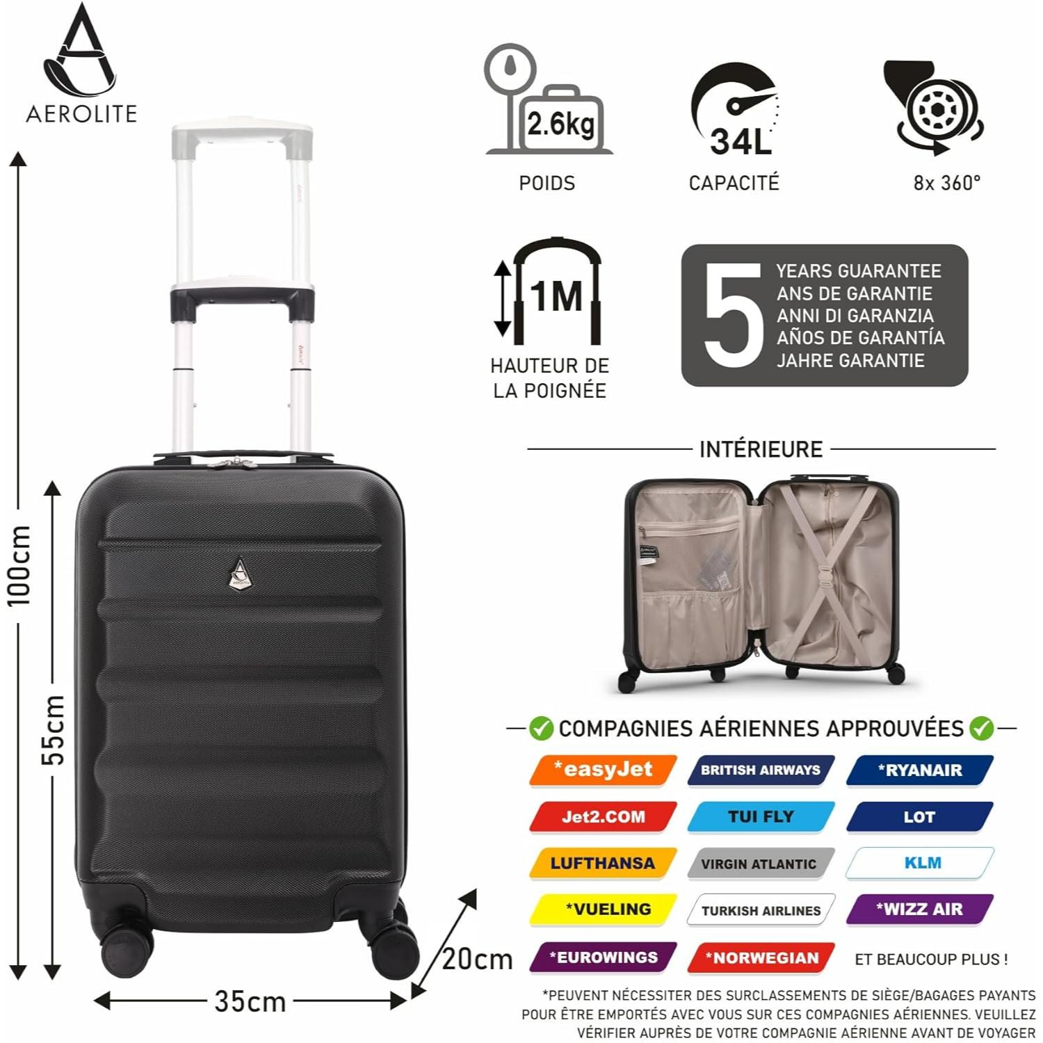 - Mesure EXACTEMENT la Taille MAXIMUM Autorisée: La marque Aerolite est fière de proposer des sets des valises les plus légères du monde ; celles-ci permettent à des millions de voyageurs de profiter de la meilleure expérience de voyage à travers le monde. Dimensions : 55x35x20 cm (Toutes parties incluses), 48.5x35x20 cm (Corps), Poids: 2,60 Kg, Contenance: 34 Litre